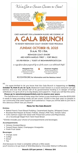 It’s time to help a worthy cause and have a great brunch while doing it!! We all know that the Senior Center in Fort Bragg is in dire straits because of funding cutbacks. The Center provides many essential services for the Coastal Community and it needs our help. Please, if you can, come and have a delightful meal prepared by MARGARET FOX and SHANNON HUGHES! It doesn’t get much better than that. Please take the time to forward this note to ten of your friends AND attend yourself! See you there!