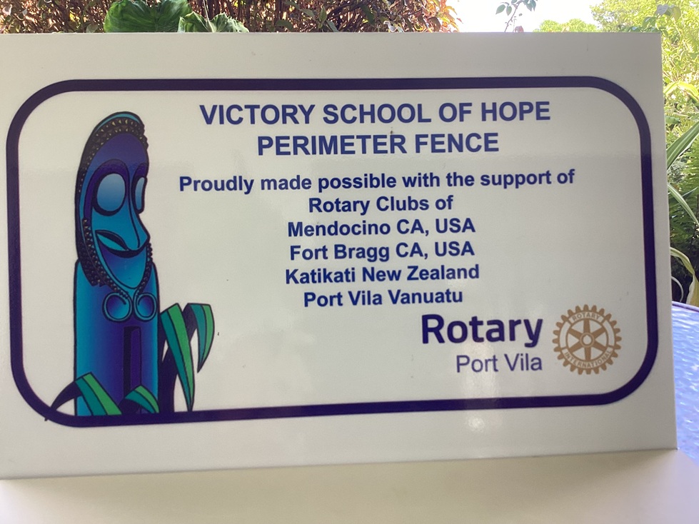 Attached is the plaque recognizing the contributions made by Fort Bragg, Katikati (New Zeland), Mendocino and Port Vila Rotary clubs to the Victory School of Hope in Port Vila, Vanuatu where we have helped since 2018 build two toilet blocks with standby water supply and appropriate sanitation, construct a boundary fence, equip a science laboratory, and repair cyclone damage. We are now "talking" with the School and Katikati about a global grant for a new library and computer center, and hope some of you will be interested in joining us in that effort.