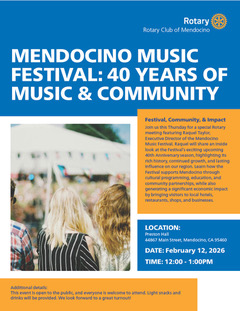 Our Speaker this week is Raquel Taylor from the Music Festival. (See Attached Flyer).