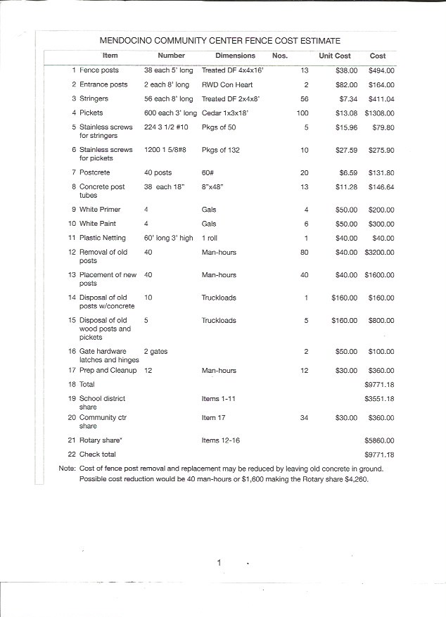 [Rotary] Subject: Community Center Fence Cost and Budget